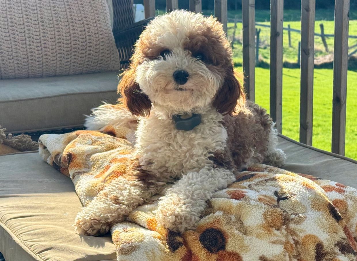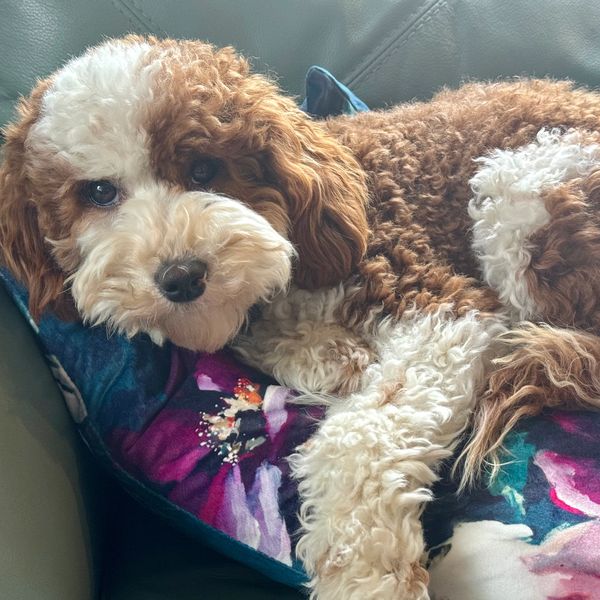 Chai is a stunning bi-colour (red & white) mini / toy cockapoo born in 2024. Chai has a very curly coat resembling that of a poodle. Chai is very petite in stature and weighs only 15 pounds. Chai's disposition is second to none, with a charismatic aura about her that makes her a favorite to all who have met her. She is playful and curious, snuggly and silly all wrapped up in a tidy pretty package. Chai loves the outdoors and loves to run in the yard with a healthy energy level. Chai is inquisitive and smart and gets along well with the other dogs. Chai lives on the Farm in Burks Falls and her besties are Harlow and Hattie.